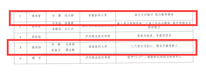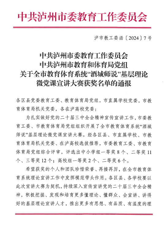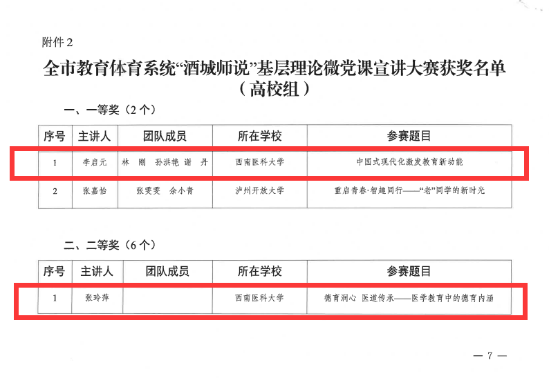 近日,市委教育工委、市教体局党组公布了全市教育系统“酒城师说”基层理论微党课宣讲大赛获奖名单,教辅后勤党委李启元主讲的《中国式现代化激发教育新动能》获一等奖,临床医学院·附属医院党委张玲萍主讲的《德育润心医道传承——医学教育中的德育内涵》、临床医学院·附属医院党委杨承营主讲的《助力乡村振兴 践行教育使命》、法学院党委陈伟伟主讲的《三尺讲台守初心,德业齐修育新人》等3个作品获二等奖。