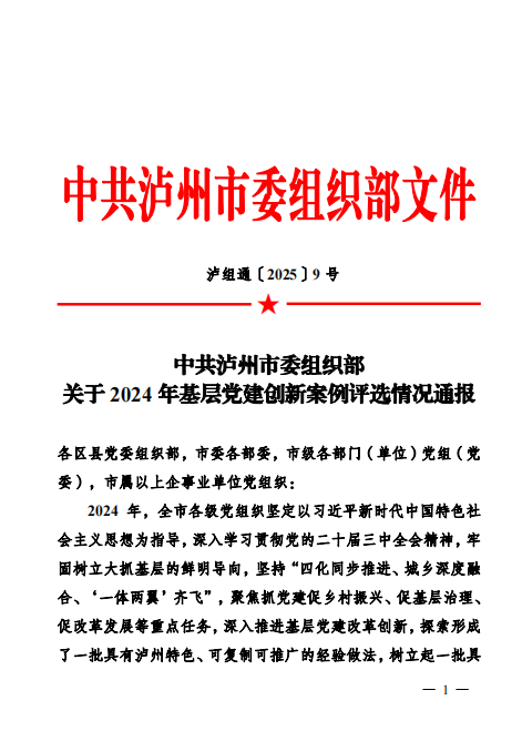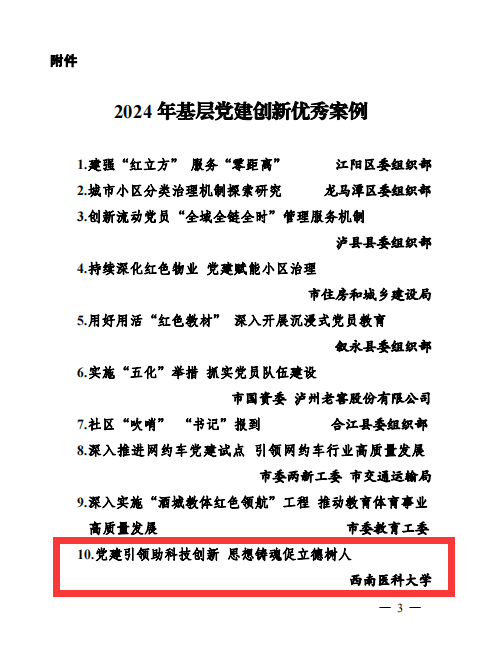 近日,中共泸州市委组织部通报2024年基层党建创新案例评选结果,全市共评选10个优秀案例。我校心研所职工党支部党建案例“党建引领助科技创新,思想铸魂促立德树人”成功入选。