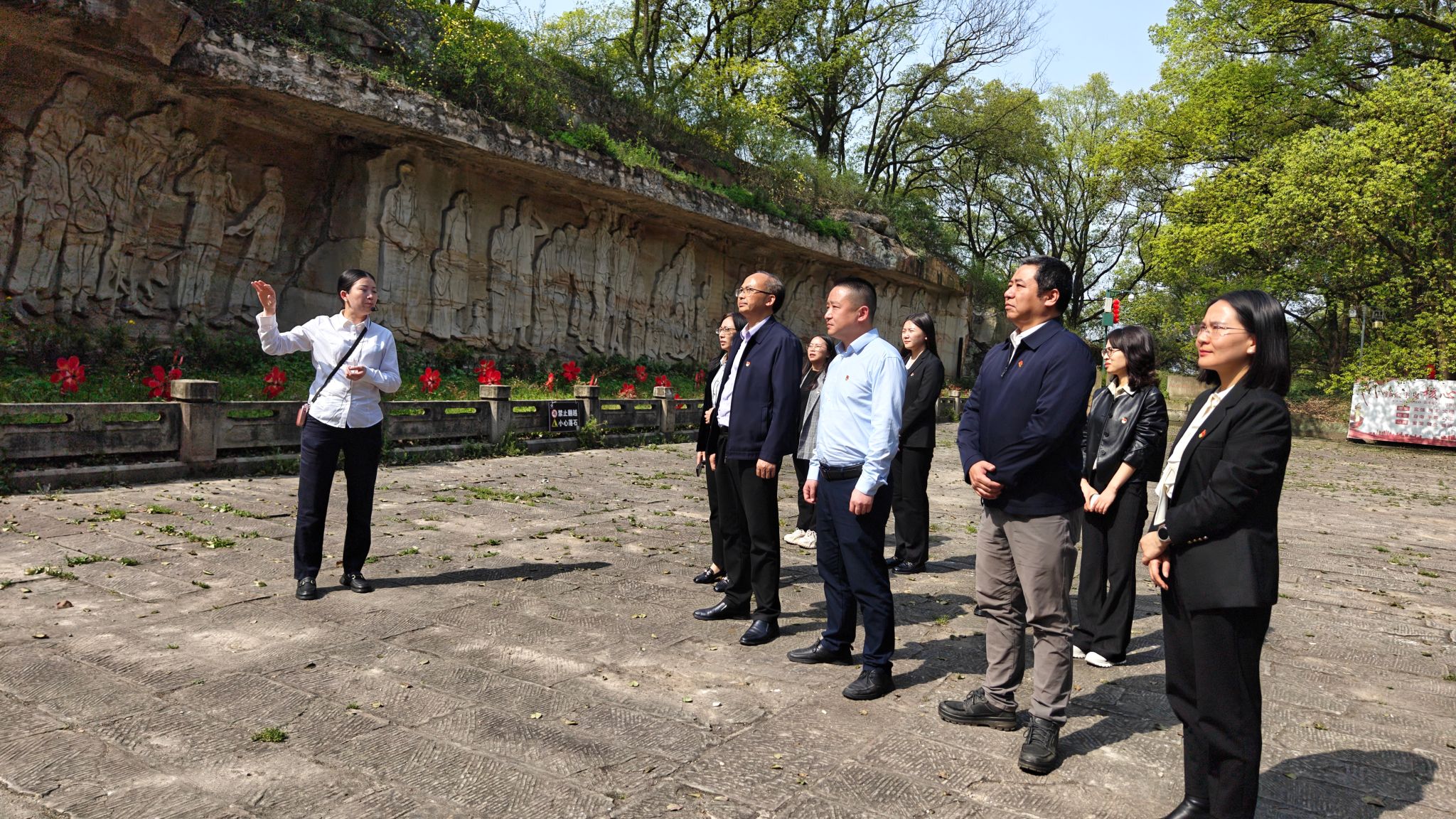 首先,支部党员参观了省级爱国主义教育基地《流民图》石刻,在41米长的巨型浮雕前,驻足凝视抗战时期百余名流民的苦难群像。现场通过“沉浸式党课”形式,结合石刻旁的《蒋兆和与流民图》历史碑文,重温了艺术巨匠以画笔为枪的抗战史诗。