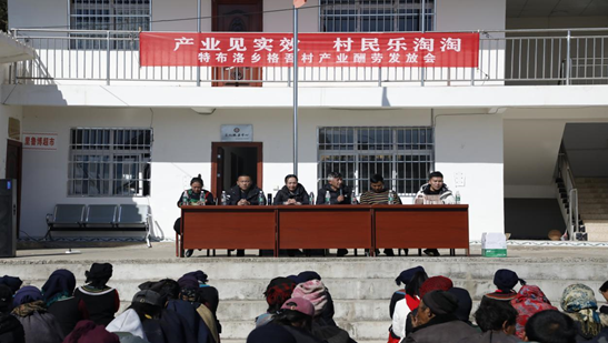 2022年2月10日,昭觉县特布洛乡格吾村充满喜气洋洋氛围——今天是格吾村举行的2022年42万产业发展酬劳发放大会,随着主持人的点名领取产业酬劳,大红票儿进腰包,村民脸上洋溢着开心满足的笑容。