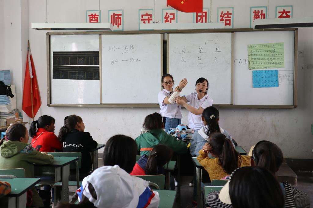 随后,老师们为格吾村的同学们开设了以“认识生命 珍爱生命”为主题的科普实践小课堂。范光碧为同学们带来了爱耳护眼小知识;刘岚通过对人体胚胎发育的讲解,让同学们认识到自己在妈妈子宫内经历的生命历程,引导学生们的感恩情怀;陈蓉详细讲解了心肺复苏急救技能,演示了AED的正确使用,罗礼容利用人体模型进行一对一指导,让孩子们尽可能地掌握心肺复苏步骤和技术要领;最后,老师们还为同学们演示了创伤包扎操作流程,着重讲解了常用的环形包扎法和三角巾包扎法。孩子们的求知欲很高,动手能力也很强,在老师和志愿者的引导下很快就学会了创伤包扎的基本方法。通过体验活动,提高了孩子们的自救和互救能力,为今后面对突发紧急情况赢得抢救时间。
