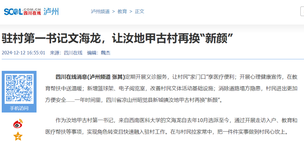 (转载)四川在线:驻村第一书记文海龙,让汝地甲古村再换“新颜”