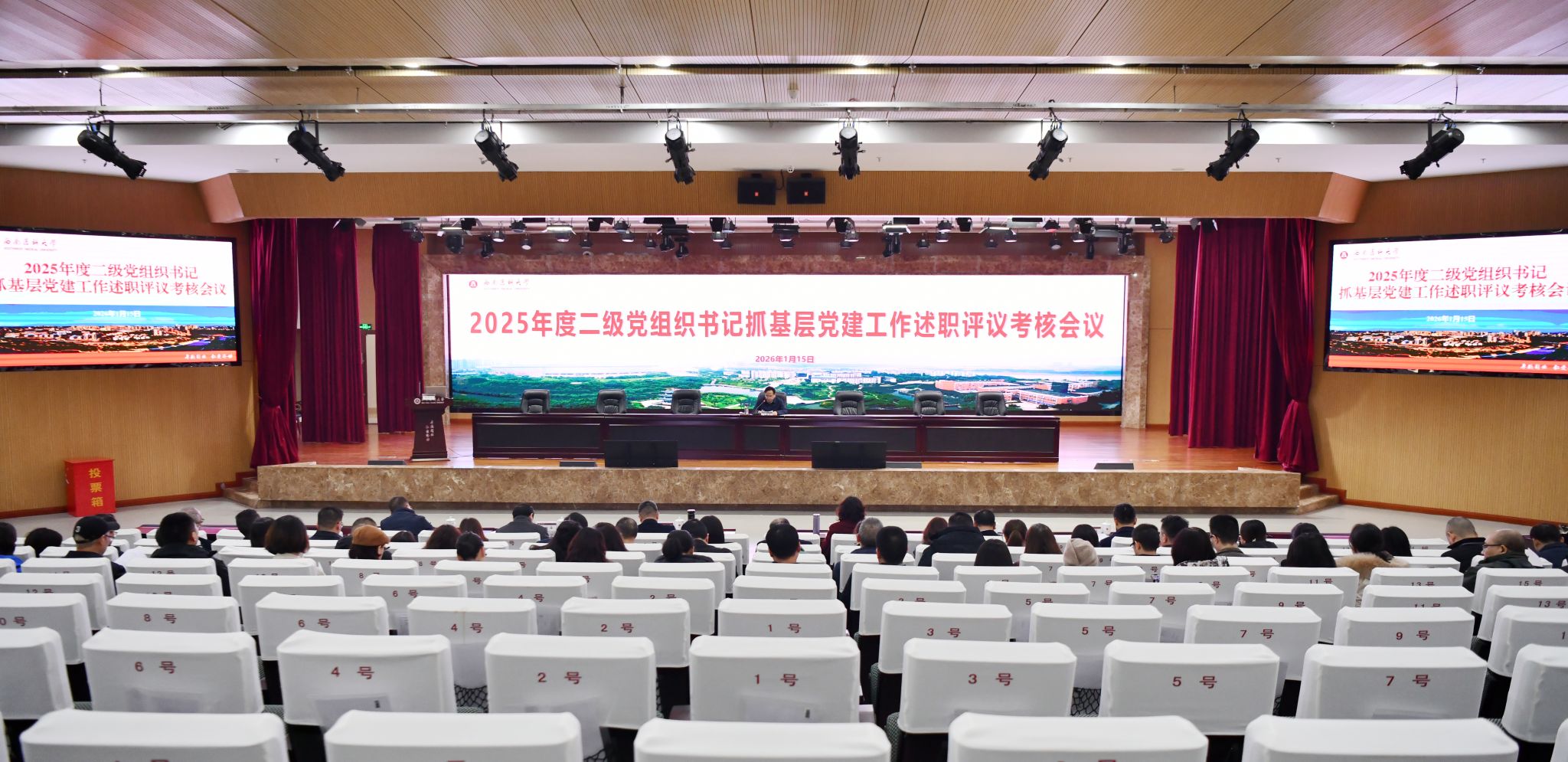 1月15日下午,2025年度基层党组织书记抓基层党建工作述职评议考核会议在城北校区第一学术报告厅召开。校党委书记张春祥主持会议并讲话,全体在校校领导、校“两委”委员,二级党组织书记、职能部门负责人、附属第四医院(附属天府医院)党委书记、五院系党总支书记参加会议。